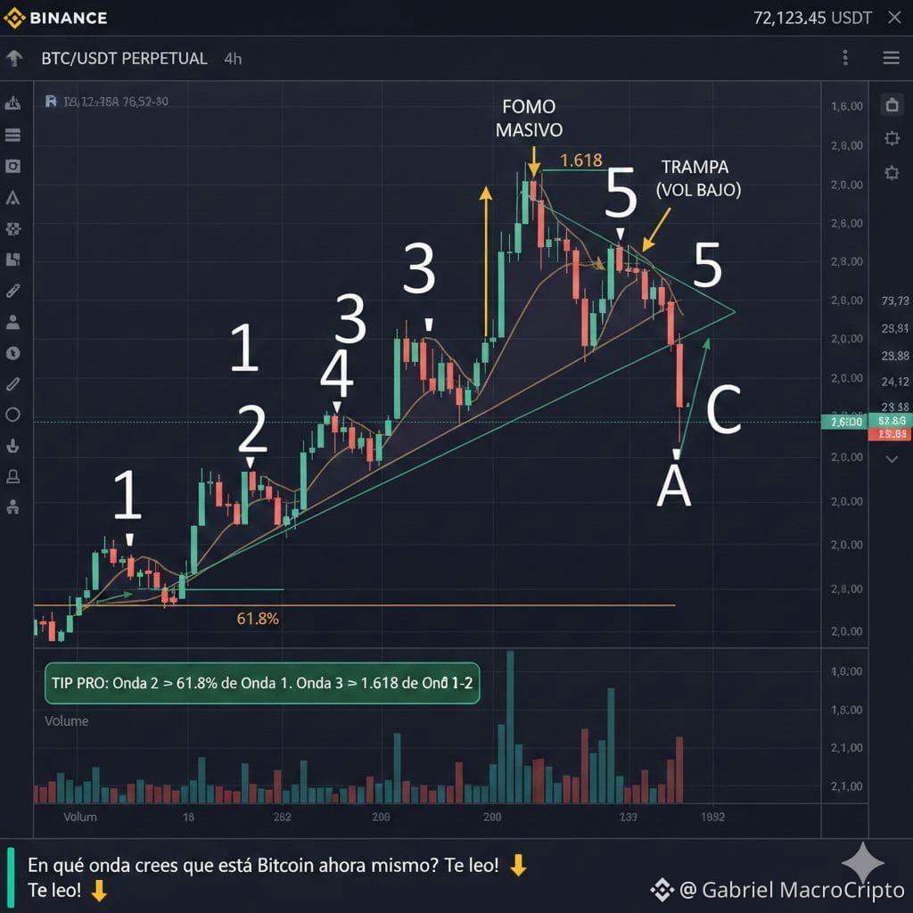 ​La Onda 5 es la trampa: El precio sube, pero el volumen suele bajar. Es donde los "manos fuertes" distribuyen a los minoristas.