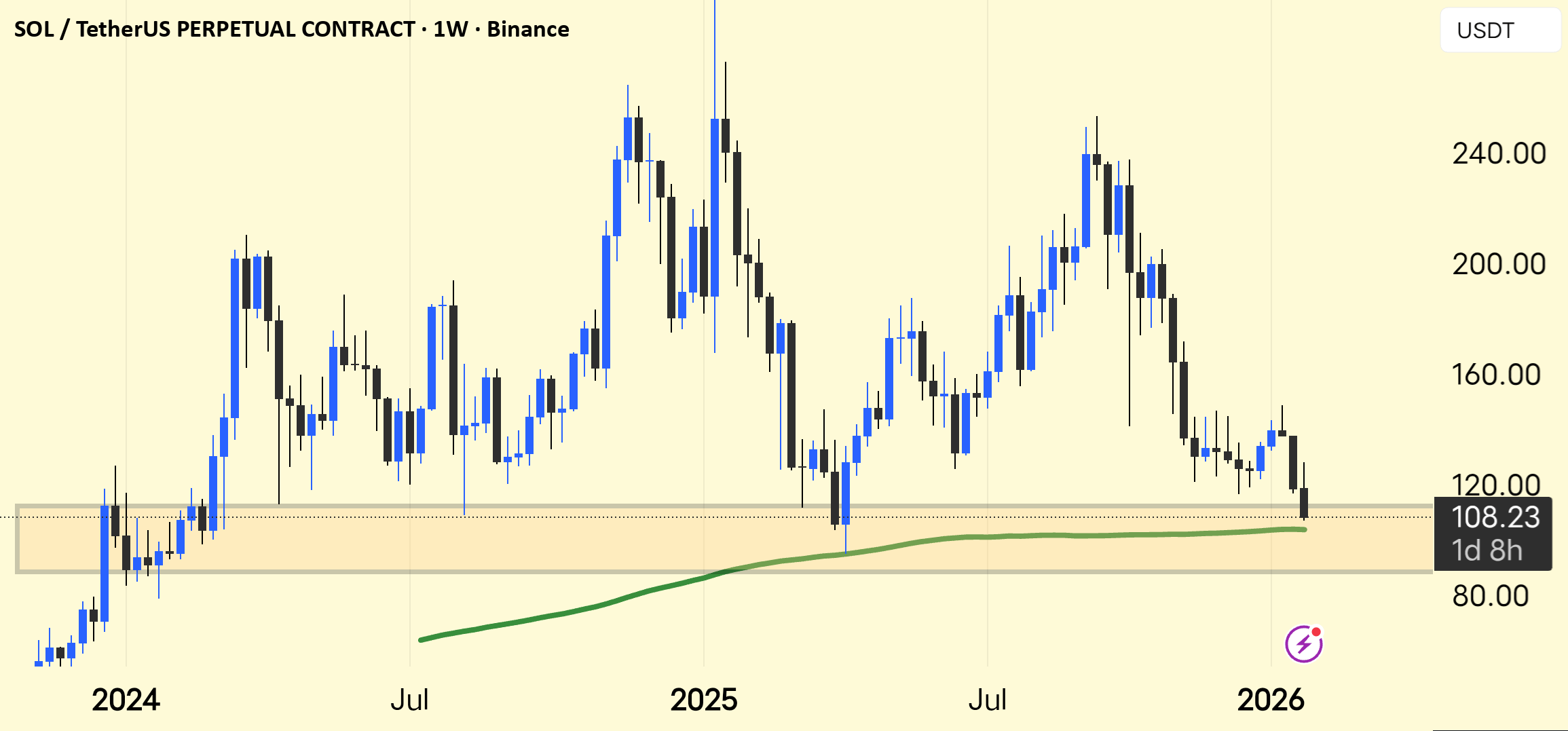 SOL testet einen wichtigen Nachfragebereich zwischen 100-110 Dollar, wo die Preise zuvor mehrfach reagiert haben.