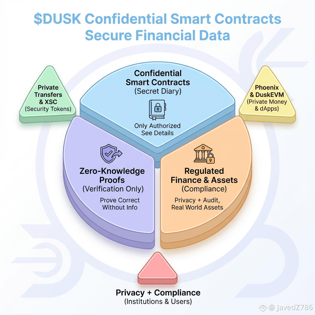 Wah bhai, this project is next level cool yaar! Most blockchains like Ethereum or others show everything to public – like who send how much money, balances, all open. Anyone can see and hackers can steal info or spy. But Dusk is different. It use confidential smart contracts to keep financial data super secret and safe.What is confidential smart contract? Simple words: normal smart contract is like open book, everyone read rules and see what happen. But in Dusk, it is like secret diary – only people who should know can see details. Others see only proof that everything correct, but no actual numbers or names. How they do this? They use zero-knowledge proofs! From white paper and official website dusk.network I learn this. Zero-knowledge means you prove something true without show the info. Like say "I am 18+" without tell my birth date. Super smart tech!In finance world, big companies, banks, institutions not want everyone know their deals. If they trade big amount or have secret bonds, stocks – if public see, bad people use that. Or even government rules say some data private. Dusk solve this. Their confidential smart contracts let you do private transfers, issue security tokens (they call XSC), and Phoenix for private money send. All this on blockchain but data hidden. Validators check with proofs only, no see private stuff. So transaction fast, final, and no one leak balance or trade history.From dusk.network site, Dusk build specially for regulated finance. Means follow rules like EU MiCA, GDPR type things. Institutions can bring real world assets (RWA) on chain – like stocks, bonds, real estate tokens – but keep privacy. No need trust bank or middleman who charge high fees. Instant settlement, automated compliance, all in one place. No more fragmentation liquidity. Users get self-custody, mean you control your wallet, no one else hold.I check recent updates too – they coming with DuskEVM in 2026 mainnet. This make it easy for Ethereum developers to come and build private dApps using Solidity but with Dusk privacy. Wow! Hedger module also use ZK proofs to shield details but allow audit if regulator want. So privacy + compliance together. Not like hide everything illegal way, but protect normal business privacy.$DUSK token is fuel for this. Use for fees, staking to secure network, governance maybe. Project look strong – investors like Cosimo X, Bitfinex etc. Team focus on real use, not hype.Why I like $DUSK so much? Because future finance go on chain, but privacy must. If no privacy, big money never come. Dusk make it possible. No more public exposure like other chains. Enterprises, businesses, even normal people can use institution level assets in wallet with full privacy.Guys, go check yourself! Visit official website dusk.network and read white paper there (they have docs too). Very easy understand if read slow. What you think? Is $DUSK going to be big for private finance? Or any other privacy coin better? Tell me in comments! I want discuss more #dusk @Dusk $DUSK