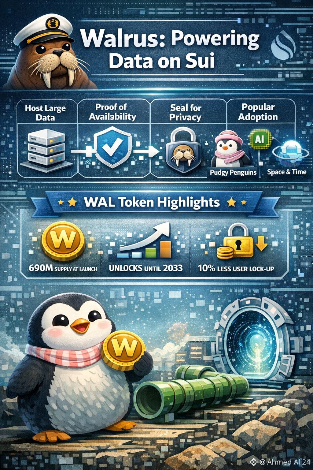 Its biggest advantage is adoption—Pudgy Penguins uses it for IP and media, AI projects rely on it for compute and storage, Pipe cuts latency, and Space & Time provide analytics. $WAL L token launches with 690M supply, unlocks linearly until 2033, and reduces user lock-ups by 10%.@Walrus 🦭/acc