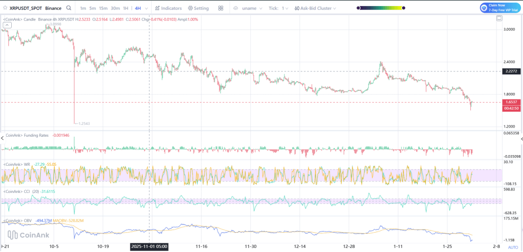 Im 4H-Chart bleibt XRP unter Druck nach mehreren Wochen fallender Höchststände und stabilen Verkäufen. Der Preis handelt jetzt in der Nähe der Zone von 1,65 $, nachdem er nicht über 1,80 $ gehalten werden konnte, was zu einer Zone starken Widerstands wurde.