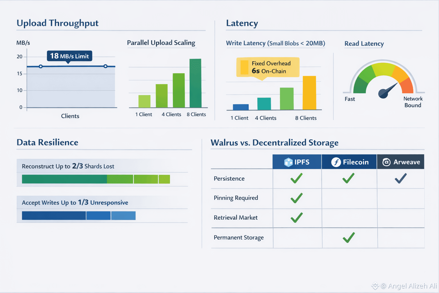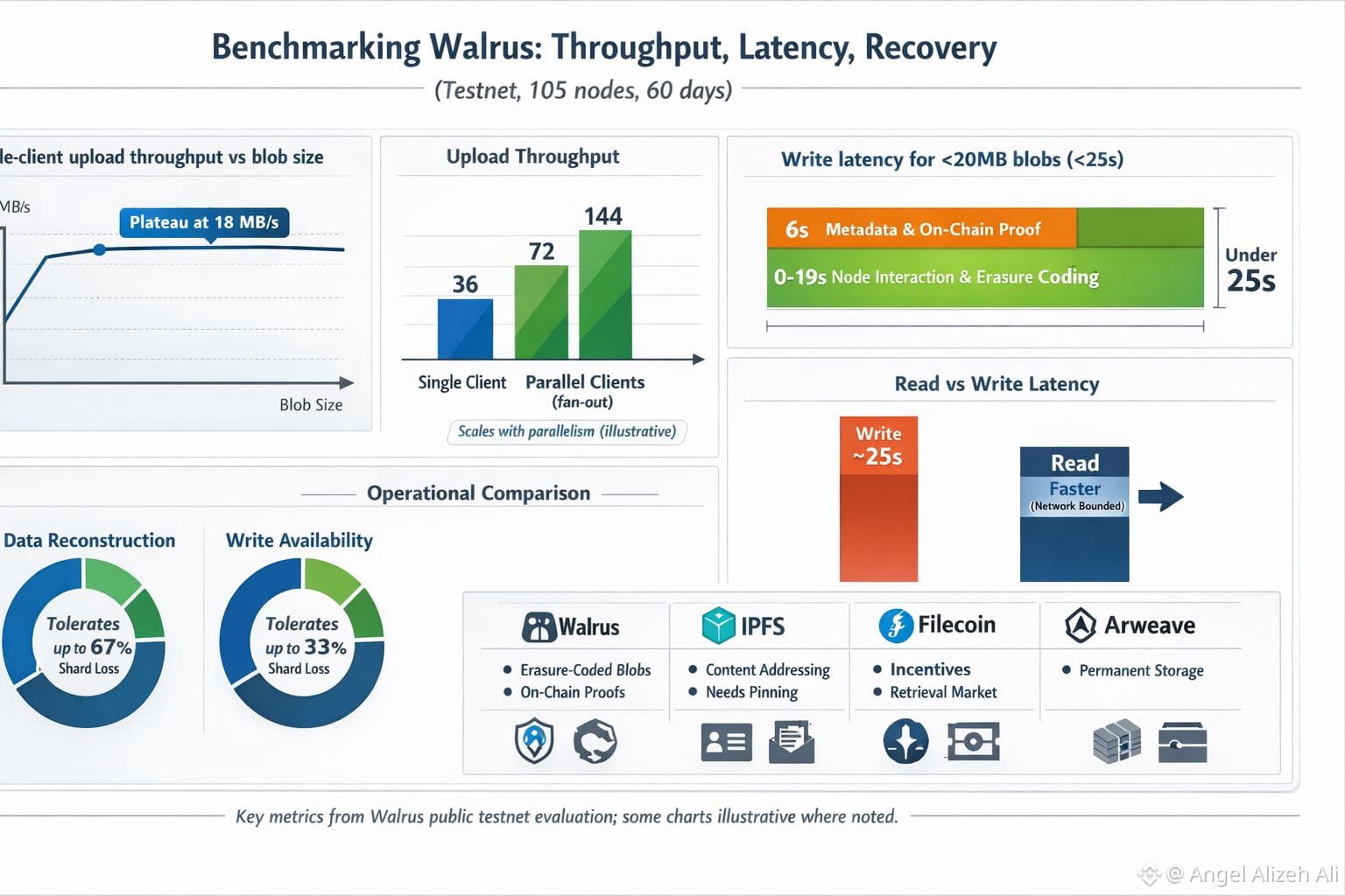 On upload throughput, Walrus is clear about its ceiling for a single client: write throughput plateaus around 18 MB/s. The reason is architectural, not a tuning problem. A write includes multiple interactions with storage nodes plus a final step that publishes a proof of availability on-chain, so you’re paying for coordination as well as bandwidth. If you need more ingest, the evaluation suggests parallel clients uploading chunks in a fan-out pattern so aggregate throughput scales with parallelism, not with heroic tuning.