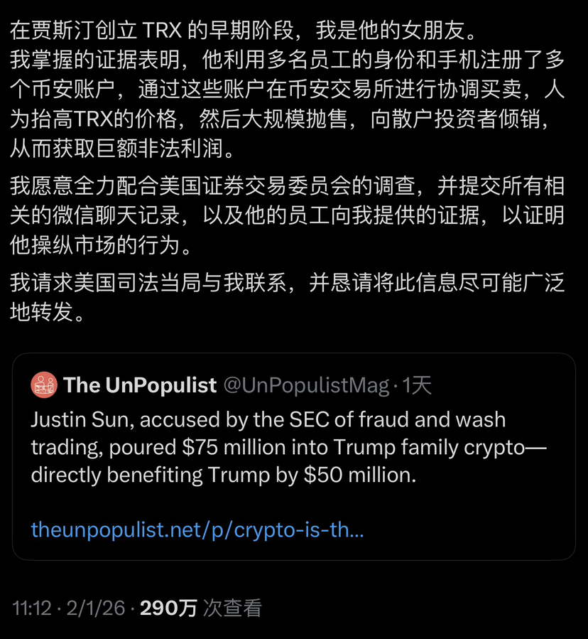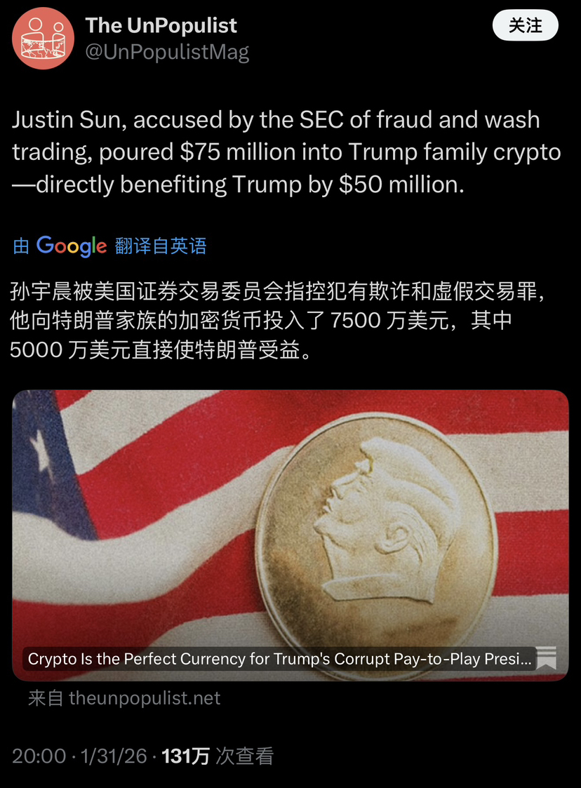 Ursprung: Eine relevante Person äußerte, dass Sun Yuchen von der US-amerikanischen Securities and Exchange Commission wegen Betrugs und falscher Handelspraktiken angeklagt wurde. Er investierte 75 Millionen Dollar in die Kryptowährung der Trump-Familie, wobei 50 Millionen Dollar direkt Trump zugutekamen.
