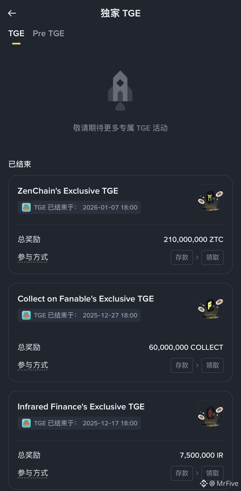 3.TGE:打新TGE,这个就是币安和官方合作的一些优质项目,会根据打新总额度来分配空投,基本都是几倍利润,好的可能十几倍,不过很久没有TGE了。