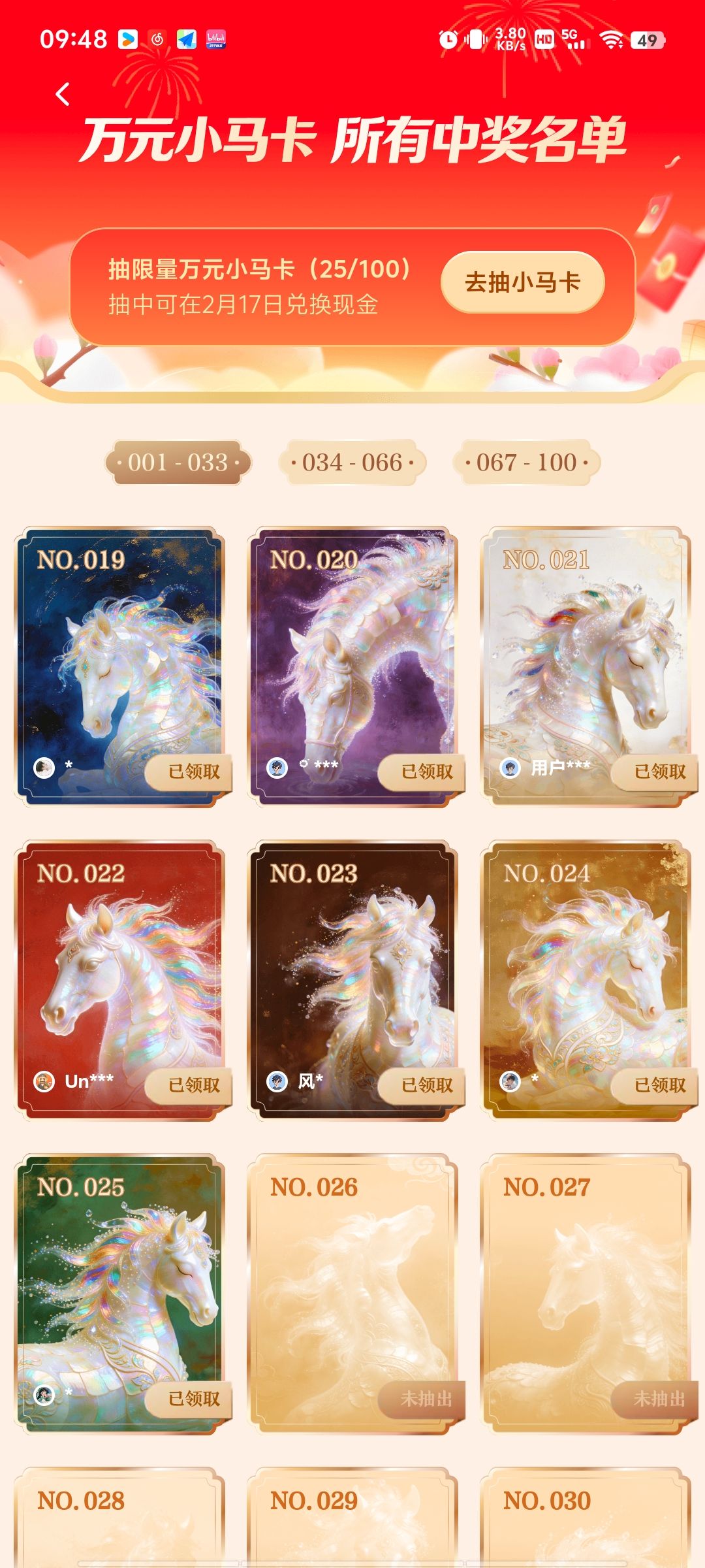 每轮活动都有100个万元小马卡限量发放,抽中后可在2月17日开奖后兑换现金。