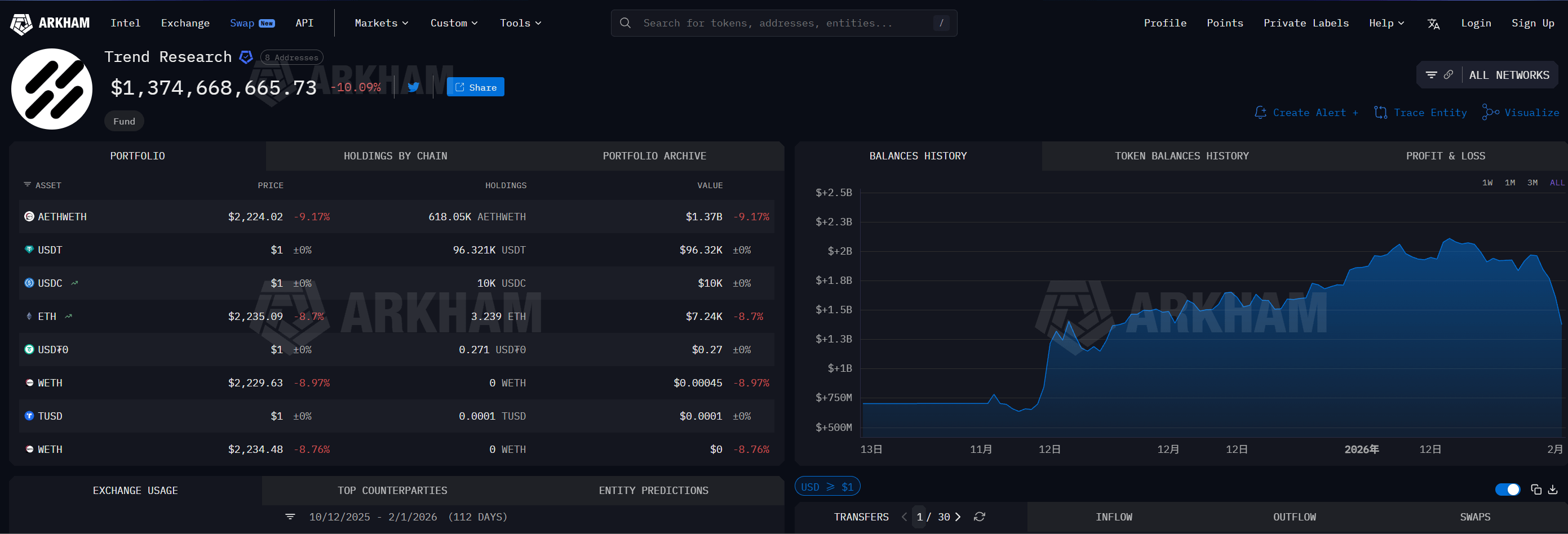 基于链上最新监控数据Trend Research(易理华实控)这个实体在AAVE V3上的仓位最近调整了不少。他们抵押了大约618,000个ETH当前价值约13.9亿美元(基于ETH现价2,246美元算)。借的稳定币总共约9.41亿美元