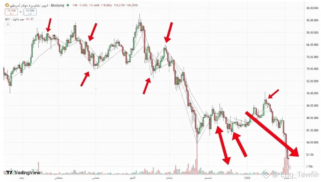 واضح جداً من الرسم إن البيتكوين فشل في الحفاظ على مستويات الـ 120 ألف دولار، وبدأ يعمل قمم أقل من بعضها. وصول السعر لـ 76,546 دولار بشمعة حمراء طويلة جداً زي اللي في الصورة، بيعكس حالة "ذعر" بين المتداولين 😱. لو استمر كسر القيعان دي، الطريق هيبدأ يتفتح لمستويات سحيقة تحت.