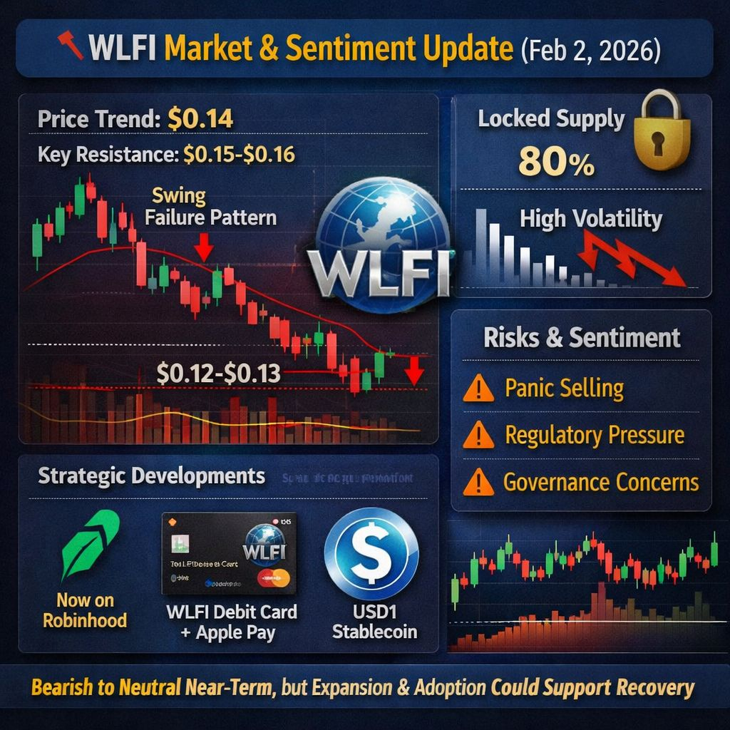 WLFI hat weiterhin Schwierigkeiten, unter dem wichtigen Widerstand im Bereich von $0.15–$0.16 zu bleiben, wobei die jüngsten Preisbewegungen eine bärische Ablehnung und steigende Abwärtsrisiken zeigen. Technische Muster wie das Swing Failure Pattern deuten darauf hin, dass die Verkäufer die Kontrolle zurückerlangt haben, und ein Test der unteren Unterstützung nahe ~$0.12–$0.13 bleibt möglich, wenn es nicht gelingt, höhere Niveaus zurückzugewinnen. �
