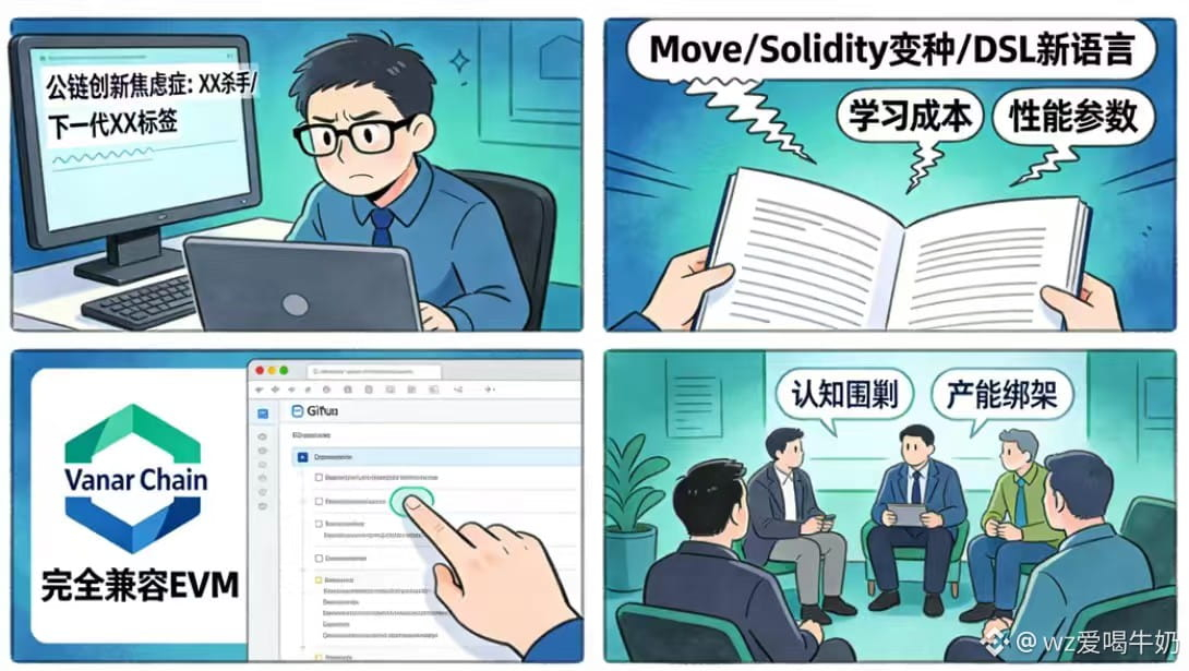 兄弟们,咱们今天聊点扎心的真相。你有没有发现,整个公链赛道,尤其是那些后起之秀,这几年都像是得了同一种“创新焦虑症”?症状就是,必须给自己贴上一个“XX杀手”或者“下一代XX”的标签,必须搞一套谁也不懂的虚拟机,必须发明一套全新的编程语言,否则就好像不够格上桌吃饭。仿佛“颠覆”成了唯一正确的姿势,“兼容”则成了没出息的代名词。但你看Vanar Chain,这个“怪胎”,它居然大摇大摆地、几乎是恬不知耻地把 “完全兼容EVM” 写在脸上,作为核心卖点之一。一开始,我也觉得这太没劲了,太“追随者”心态了。直到我最近花了几个通宵,去研究他们过去一个月的GitHub提交记录和技术社区讨论,再结合一些传统游戏大厂朋友私下吐的苦水,我才猛地惊出一身冷汗——我们可能都理解错了。Vanar的“兼容”,压根不是一种妥协或追随,它可能是一场设计极其精密的、针对未来五年开发者心智的 “认知围剿”和“产能绑架”。