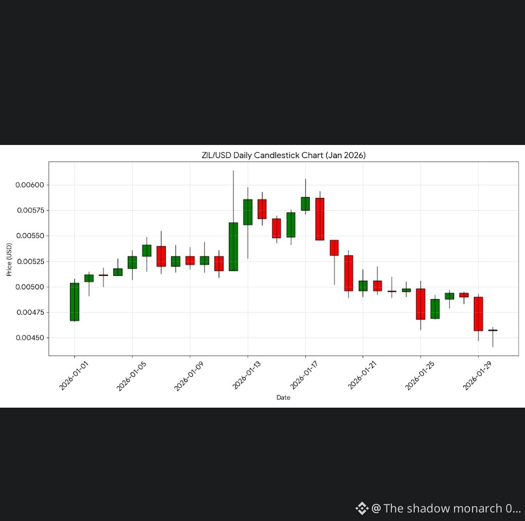 As shown in the candlestick chart below, ZIL experienced significant volatility in January 2026. After a mid-month rally that saw prices climb toward \$0.0061, the token entered a corrective phase, closing the month near the \$0.0045 support level. This represents a substantial decline from its all-time high (ATH) of approximately \$0.25 in 2021, reflecting the broader "altcoin winter" conditions while maintaining a stable core of network activity.