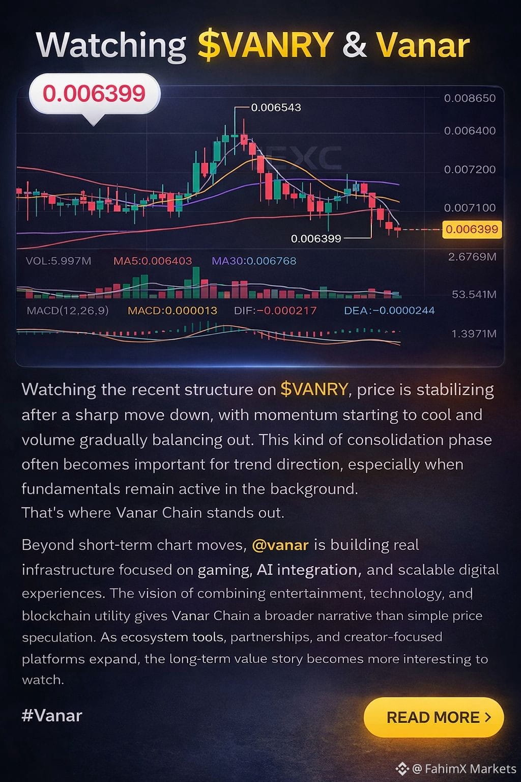 $VANRY Watching the recent structure on $VANRY, price is stabilizing after a sharp move down, with momentum starting to cool and volume gradually balancing out. This kind of consolidation phase often becomes important for trend direction, especially when fundamentals remain active in the background. That’s where Vanar Chain stands out.