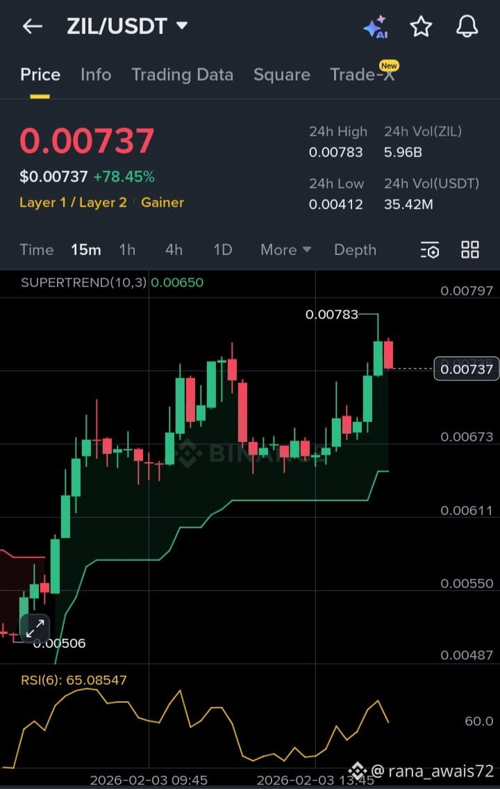 $ZIL IL has seen a sharp price expansion after breaking above the key resistance zone around 0.0065–0.0067, supported by strong volume and increased market participation. The breakout triggered momentum buying and short covering, pushing price toward the 0.0078 area. On lower timeframes, trend indicators remain bullish, and momentum is still intact as long as price holds above the prior breakout zone. This move also aligns with broader short-term rotation into low-cap Layer-1 assets, which tend to react aggressively once liquidity enters. However, after a strong impulsive move, short-term consolidation or pullbacks are a normal market behavior.
