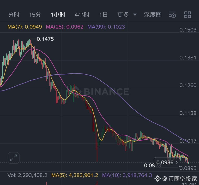 但切到第二张图,视角缩窄到最近几天,感觉立刻就变了。价格在0.09到0.10这个狭窄的箱体里反复摩擦,虽然今天还是跌了近7%,但看那24小时最低点0.0923,距离现价0.0936也就一线之隔。MA7和MA25几乎粘合在一起,波动率明显收窄。这幅图景传达的信号不再是“自由落体”,而是“跌势趋缓,多空在当前位置激烈博弈”。甚至委托订单的买卖比例(55% vs 45%)也显示出一种微妙的平衡,并非单边抛售。