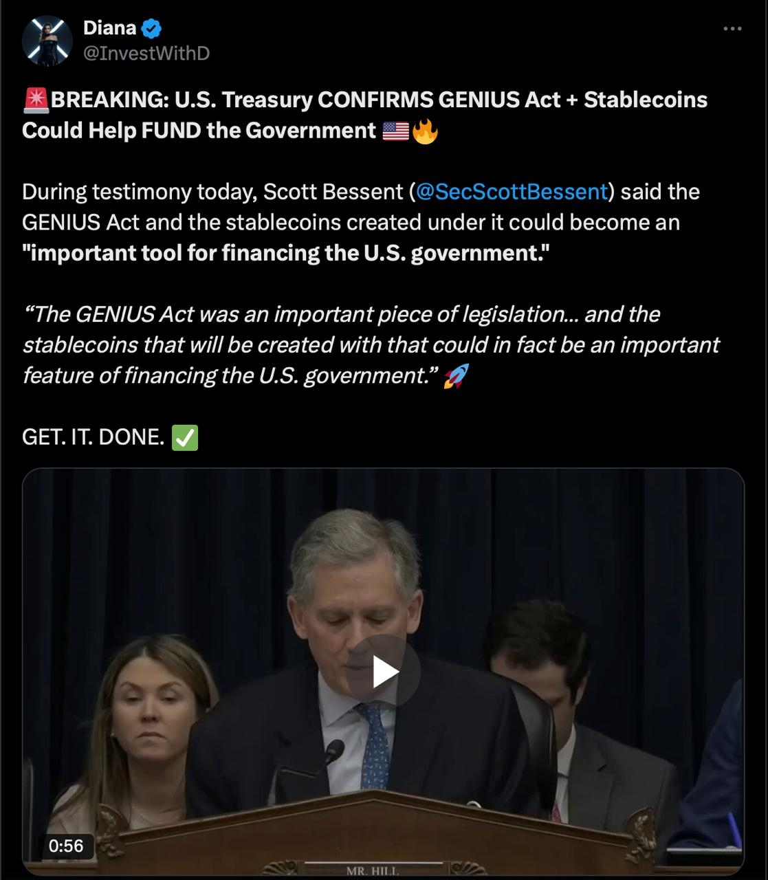 At the same time, momentum is building in the United States around stablecoin legislation. During recent testimony, U.S. Treasury Secretary Scott Bessent said that the GENIUS Act and the stablecoins created under it could become an “important tool for financing the U.S. government.”