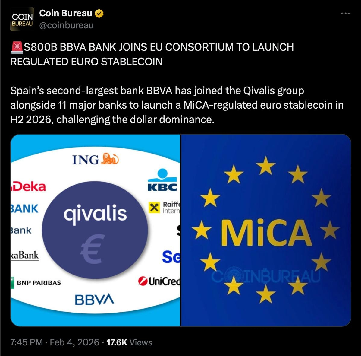 BBVA’s entry into the QiValis group brings additional weight to a consortium that already includes several of Europe’s largest banks. The planned euro stablecoin will operate under the European Union’s Markets in Crypto-Assets (MiCA) framework, which establishes strict rules around reserves, transparency, governance, and consumer protection.