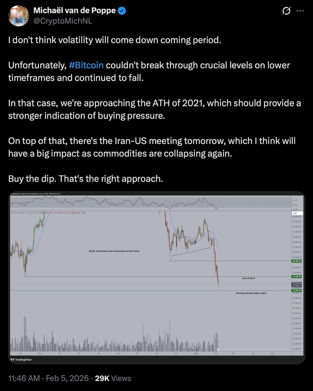 Market analyst Michael van de Poppe said volatility is unlikely to cool down in the near term, noting that Bitcoin failed to reclaim key resistance levels on lower timeframes.