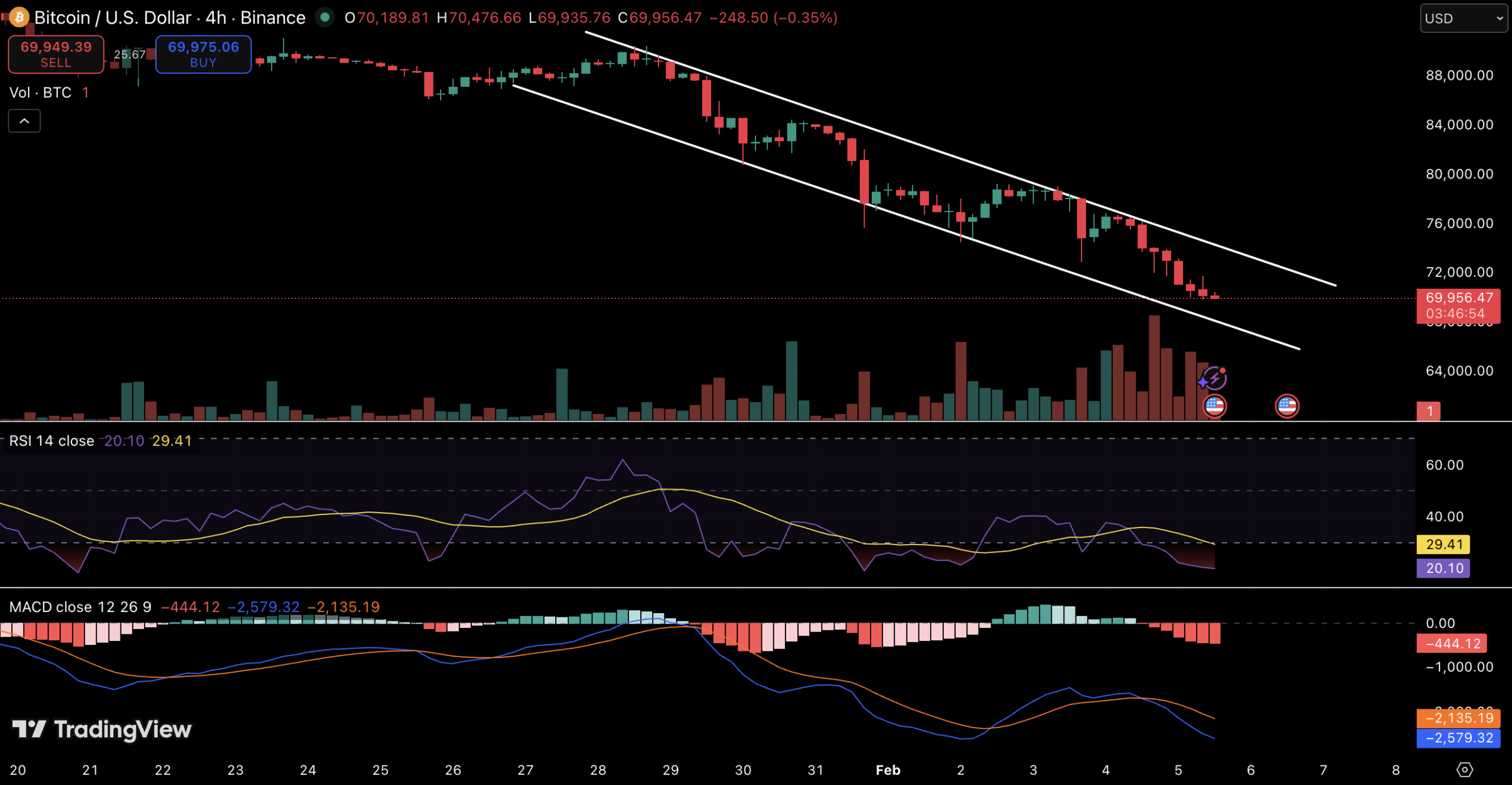 Bitcoin briefly dropped below the $70,000 mark, extending a sharp downside move that has defined the past several sessions.