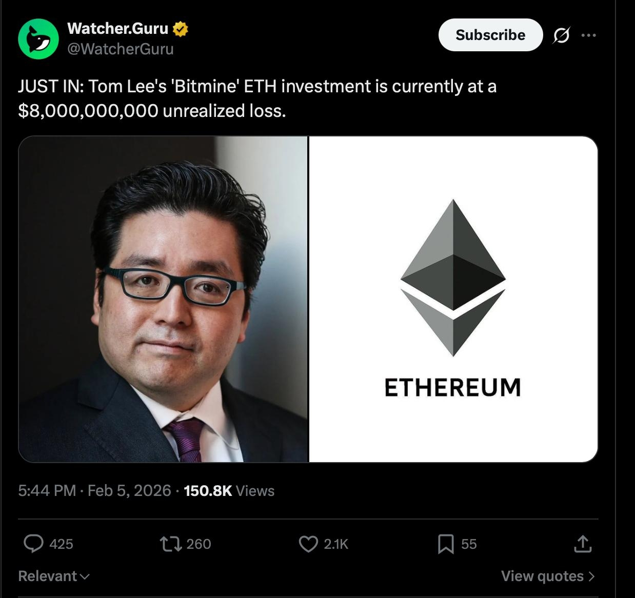 Bitmine is facing an even steeper paper drawdown in dollar terms, with roughly $8 billion in unrealized losses tied to its 4.2 million ETH position. Ethereum’s sharper percentage decline relative to Bitcoin over the past week has amplified the impact, pushing Bitmine’s exposure deeper into negative territory as risk appetite across altcoins deteriorates.