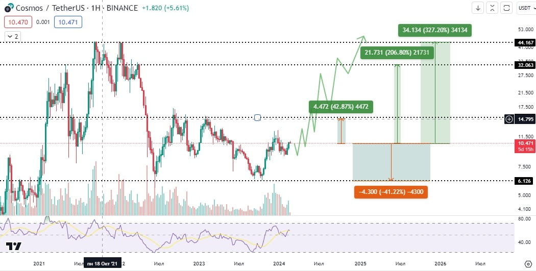 Somit ist die Cosmos-Plattform selbst eine dezentrale Austauschplattform. Dieses Projekt unterstützt intelligente Verträge innerhalb des Netzwerks. Der Coin fiel derzeit um -87 % seines Höchststands. Allerdings ab Juni 2022 befindet sich im Stadium der „Akkumulation“ und liegt immer noch in der Nähe des globalen Niveaus. Die Münze beginnt bei hohen Volumina zu wachsen, und dies ist ein starkes mittelfristiges Signal für eine Long-Position.