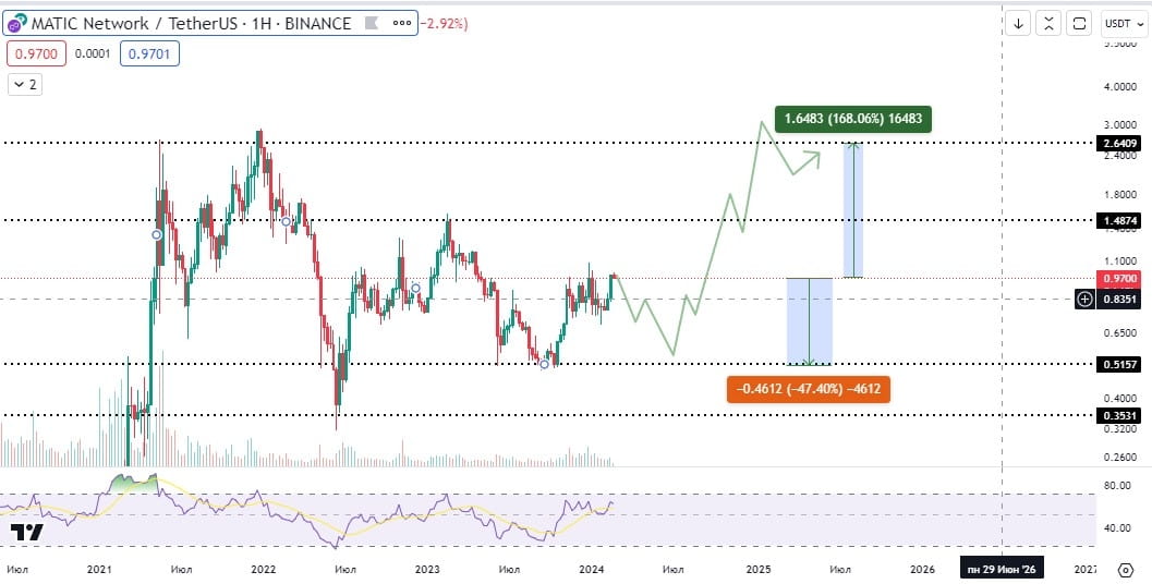 Der Coin erreichte den Tiefpunkt bei 0,5 $, als der Preis im Juli 2022 unter diese Unterstützung fiel, kam es zu einem sehr schnellen Rückkauf. Ein zuversichtliches Wachstum der Münze wird es erst nach einer Konsolidierung über dem Niveau von 1,5 $ geben, nur in diesem Fall können wir über eine Aktualisierung des Höchststands sprechen. Der RSI-Indikator im täglichen Zeitrahmen ist entladen (48). Es gibt auch eine neutrale Zone (49) im Wochenrahmen – ein guter Zeitpunkt, um eine erste Anlageposition aufzubauen. Sie müssen die Tatsache akzeptieren, dass die Münze in den kommenden Monaten einen Rückgang von bis zu 40 % verzeichnen kann, und wenn dieses Szenario eintritt, können Sie die Position mitteln.