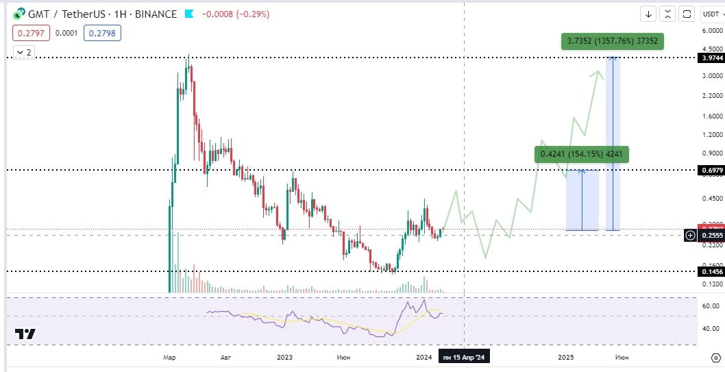 Die GMT-Münze ist seit Anfang 2022 an großen Börsen notiert und befindet sich seitdem aufgrund des Bärenmarkts im Rückgang. Doch nun hat der Preis den Abwärtstrend hinter sich gelassen und es gibt erste Anzeichen einer Trendwende. Der Coin ist bereits um -96 % gefallen und das Spiel funktioniert und entwickelt sich unterdessen weiter. Das Wachstum ausgehend von Mindestwerten erfolgt volumenmäßig – was ebenfalls positiv ist. RSi im wöchentlichen Zeitrahmen ist neutral (62), im täglichen Zeitrahmen (67).