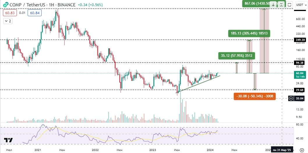 🛠️ Während der Bärenmarktperiode vom 22.–23. Die Münze wurde gegenüber dem historischen Maximum um -97 % reduziert. Ab Juni 2023 Eine große Lautstärke begann in COMP einzudringen (auf dem Lay selbst) – ein sehr gutes Signal. Laut technischer Analyse des täglichen Zeitrahmens betritt der Coin gerade den überkauften Bereich (70). Im Wochenrahmen - neutral (57).