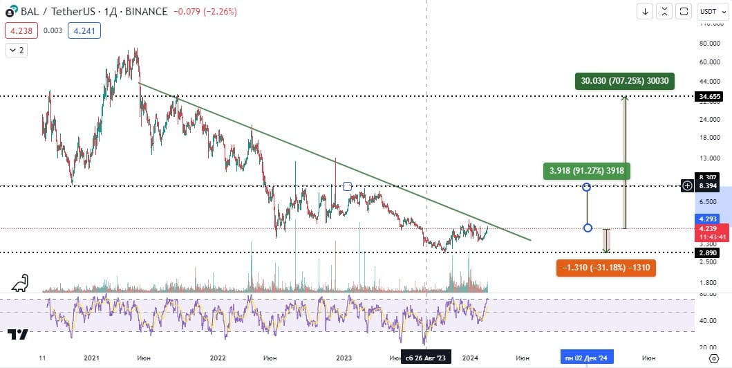 🛠️ Während der Bärenmarktperiode vom 22.–23. Die Münze wurde gegenüber dem historischen Maximum um -96 % reduziert. Ab Oktober 2023 Ein großes Volumen hat begonnen, in den BAL einzudringen (auf dem Niveau selbst), was ein starkes Signal für eine baldige Umkehr darstellt. Laut technischer Analyse des täglichen Zeitrahmens betritt der Coin gerade den überkauften Bereich (70). Im Wochenrahmen - neutral (53).