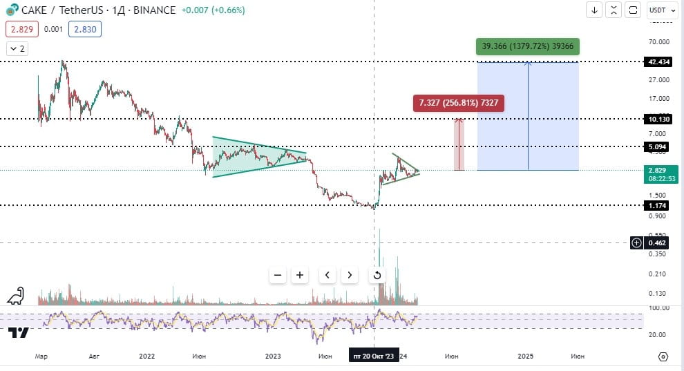 Der CAKE-Coin wurde erst am Ende des Bullenmarktes 2021 an großen Börsen notiert. Daher sieht die Grafik ekelhaft aus... ABER! Im Oktober stieg der Coin bei enormen Volumina um 120 %. Da der Coin zuvor am Tiefpunkt war, ist es logisch anzunehmen, dass dieses Volumen in Käufe geflossen ist. Im täglichen Zeitrahmen hat der Preis den RSI-Indikator auf 60 abgesenkt. Im wöchentlichen Zeitrahmen liegt der Coin ebenfalls im komfortablen Bereich von 60, sodass der Coin mittel- und langfristig ein großes Wachstumspotenzial hat.