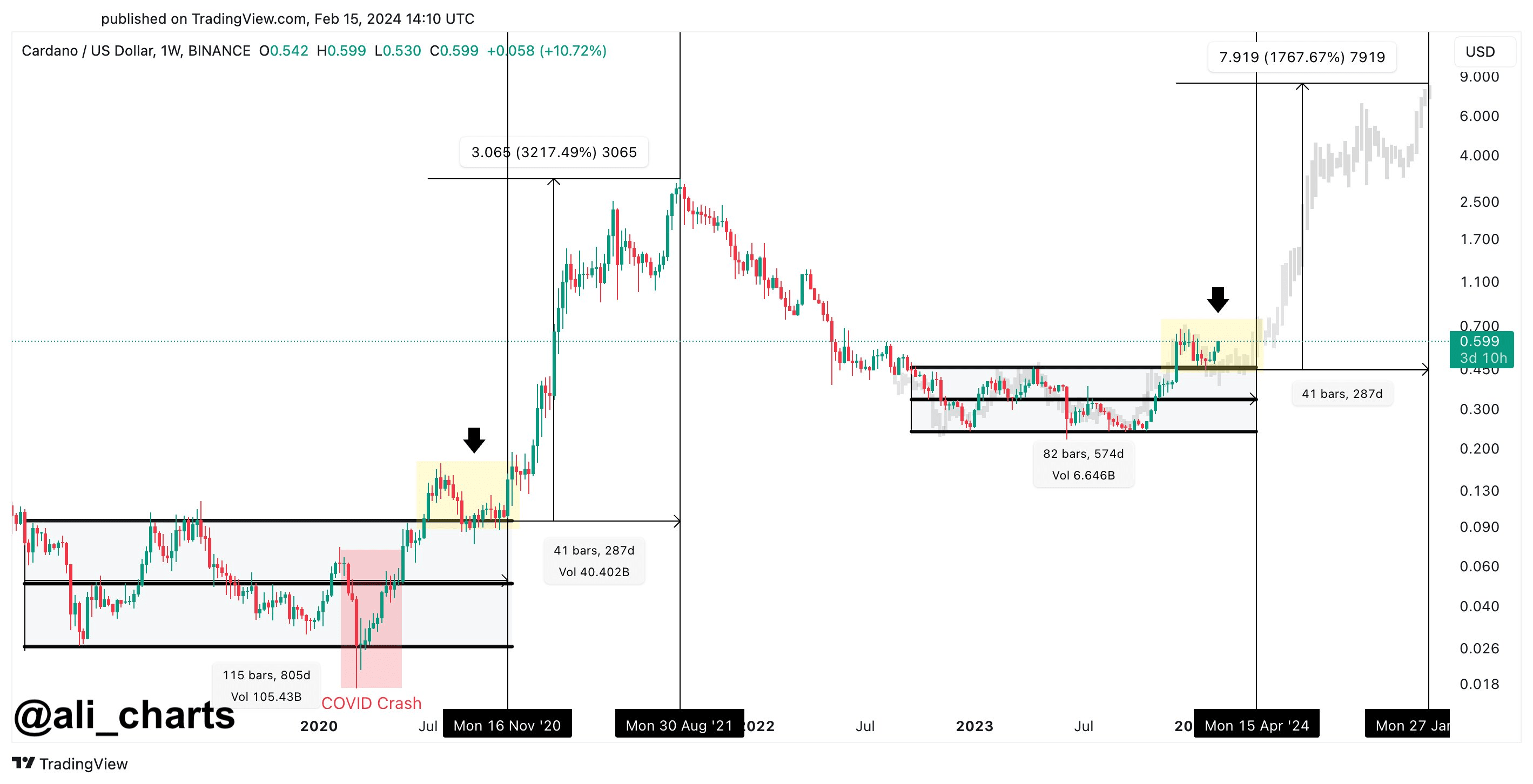 „Der Cardano-Ausbruch könnte früher als erwartet erfolgen! Wenn sich die Geschichte jedoch wiederholt, erwarten wir, dass ADA auf 0,80 US-Dollar steigt, auf 0,60 US-Dollar zurückfällt und dann im Januar 2025 einen Bullenlauf in Richtung 8 US-Dollar einleitet“, sagte Ali in einem Tweet.