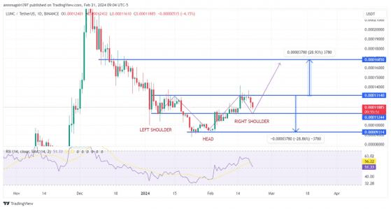 •Umgekehrt, wenn die Marktstimmung pessimistisch wird. Der LUNC-Preis könnte auf das Unterstützungsniveau von 0,0001 USD fallen. Anhaltende Abwärtstrends könnten den Preis weiter nach unten drücken und ihn der unteren Unterstützungsschwelle bei 0,00009 USD nähern.