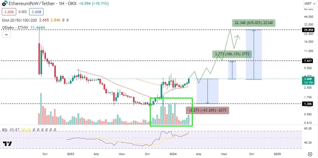 Von historischen Höchstständen ist der Coin um -95 % gefallen, aber der Coin beginnt bereits zum Leben zu erwachen und beginnt, bullische Muster zu entwickeln. Im schlimmsten Fall lohnt es sich, einen Rückgang um -60 % gegenüber dem aktuellen Preis in Betracht zu ziehen (im Falle einer Marktkrise). Die Münze erhielt Unterstützung bei der 1,2-Dollar-Marke, testete diese Marke dreimal und bildete einen Boden. Sie können bereits sehen, wie ETHW in großen Mengen auf dem Markt und an mehreren Börsen gleichzeitig gehandelt wird. Der Coin ist vor Ort für einen mittelfristigen Long interessant.