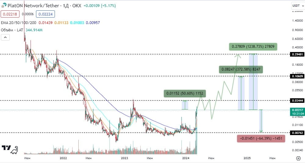 Von historischen Höchstständen aus hat der Coin bereits -99 % verloren, aber selbst jetzt zeigt die Grafik, wie auf dem Höchststand ein großes Volumen in den Coin einzudringen begann. Im wöchentlichen Zeitrahmen ist der RSI bereits in die überkaufte Zone (82) eingetreten. Hier bestehen Korrekturrisiken, allerdings ist das Wachstumspotenzial hier überproportional groß. Die Münze ist bereits heiß und könnte möglicherweise ein schnelles X einbringen. Der Preis hat eine Unterstützung bei 0,006 $ erhalten und dies ist wahrscheinlich der Tiefpunkt der Münze. Es macht keinen Sinn, einen Trade zu stoppen, da dieser leicht aufgehoben werden kann. Gehen Sie einen Handel mit angemessener Größe ein.
