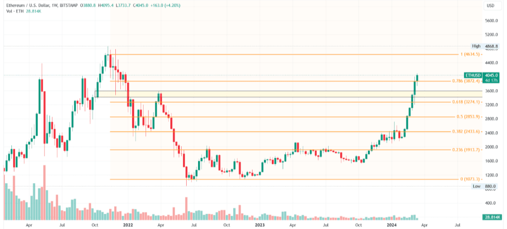 Da die ETH-Preise in den letzten sieben Wochen um 81 % gestiegen sind und nur noch wenige Stunden bis zum Dencun-Upgrade verbleiben, steigt auch die Nachfrage. Basierend auf den Fibonacci-Werten wird erwartet, dass der ETH-Preis bald die 5.000-Dollar-Marke durchbrechen und sogar einen Bullenlauf auf die 6.835-Dollar-Marke auslösen könnte.