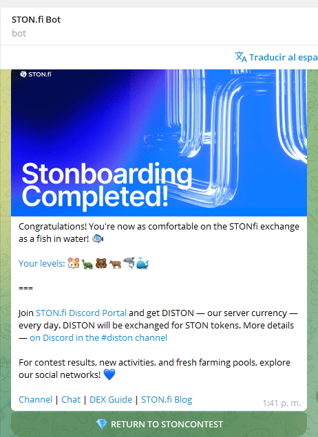 Es ist Zeit, auf Stonboarding zu klicken (wie gesagt, wenn Sie diesen Wettbewerb bereits zuvor abgeschlossen haben, wählen Sie einfach das Token aus der Liste aus, das Sie zuvor für die Aufgaben verwendet haben, und fahren Sie fort. Der Bot bestätigt automatisch, ob Sie die entsprechenden Aufgaben erledigt haben, und bringt Sie auf die nächste Ebene, die STONcomp entspricht.