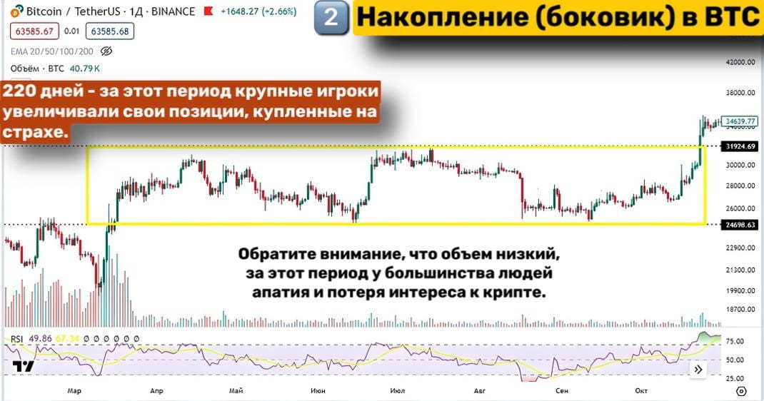 Je länger die Akkumulation seitwärts verläuft, desto stärker und länger wird die Aufwärtsbewegung sein. Bei einem Seitwärtstrend halten große Player den Preis in einem bestimmten Bereich und lassen nicht zu, dass der Preis unter/über ein bestimmtes Niveau fällt. In diesem Moment sammeln oder entladen die Wale ihre Positionen. Wie Sie das ermitteln, verraten wir Ihnen in den folgenden Beiträgen. Das Ergebnis jeder Seitwärtsbewegung ist ein scharfer Impulsaustritt nach oben oder unten (meistens nach oben).