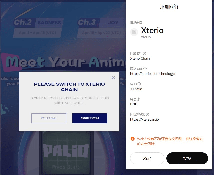 Klicken Sie nach Abschluss weiterhin auf die Schaltfläche „Ihr Pailo-Ei beanspruchen“. Daraufhin wird eine Aufforderung zum Wechseln des Netzwerks angezeigt. Klicken Sie auf die Schaltfläche „Wechseln“, und eine Aufforderung zum Hinzufügen des Xterio-Netzwerks wird angezeigt. Klicken Sie auf „Autorisieren“, um das Netzwerk hinzuzufügen.