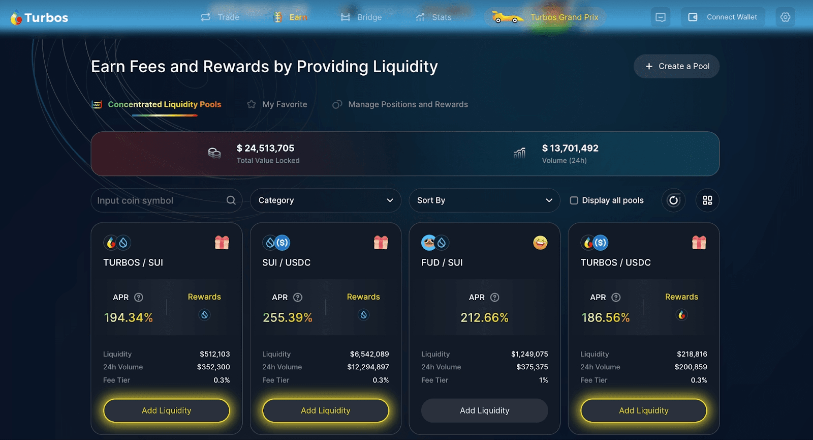 Turbos Finance hat seit seiner Einführung im Juni 2022 Investitionen von Institutionen wie Mysten Labs und Jump Crypto angezogen. Das zentralisierte Liquiditätsdesign von Turbos ermöglicht es Benutzern, marktbildende Preisspannen anzupassen und die Rendite auf der Grundlage der entsprechenden jährlichen Rendite (APR) zu maximieren, während höchst ungewisse Verluste vermieden werden. Darüber hinaus hat Turbos die #wormhole-Funktion integriert, um Benutzern den kettenübergreifenden Handel mit Vermögenswerten zum Sui Network zu erleichtern.