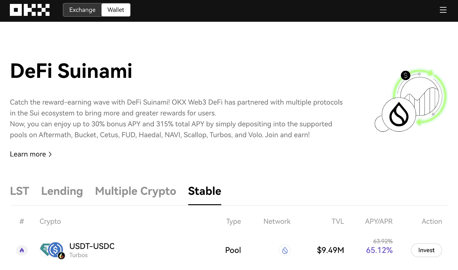 Unter anderem können TURBOS-SUI- und SUI-USDC-Pools zusätzlich zum Umsatzanteil der Transaktionsgebühren auch zusätzliche SUI-Mining-Belohnungen erhalten. Zusätzlich zu den ökologischen Token von SUI können Benutzer auch USDT-USDC-Stablecoins in zwei Währungen für das Mining in Turbos bereitstellen, mit einer Rendite von über 64 %.