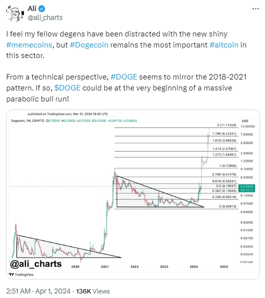 Laut einem aktuellen Tweet des Kryptowährungsanalysten Ali Martinez spiegelt Dogecoin derzeit das Muster wider, dem es zwischen 2018 und 2021 folgte.
