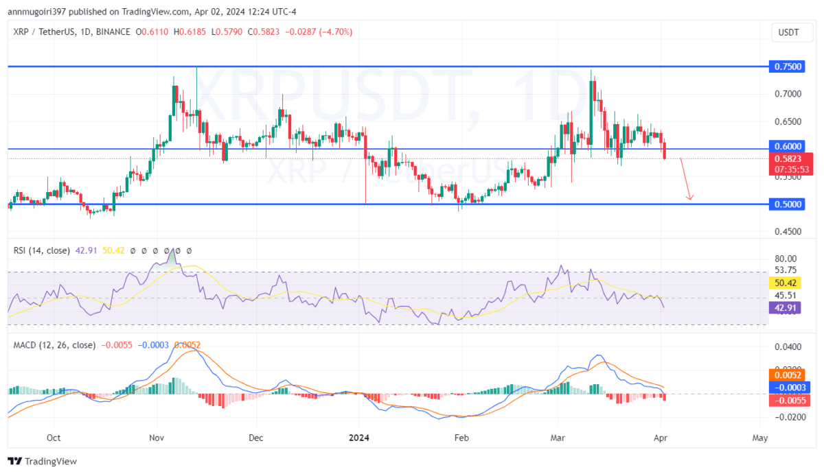 Der XRP-Preis fiel letzten Monat um 7,52 % und letzte Woche um 8 %, was auf einen rückläufigen Markttrend hindeutet. Angesichts der allgemein pessimistischen Marktstimmung schwankte der Preis von XRP letzte Woche größtenteils zwischen 0,63 und 0,58 US-Dollar. Der anhaltende Kampf zwischen bärischen und bullischen Kräften, bei dem die Bären vorübergehend die Oberhand gewinnen, kennzeichnet die Marktvolatilität.