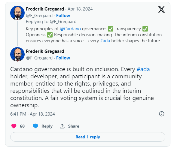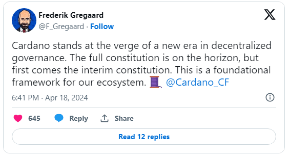 Laut Gregaards X-Post „steht Cardano am Beginn einer neuen Ära der dezentralen Verwaltung. Die vollständige Verfassung ist in Sicht, aber zuerst kommt die Übergangsverfassung. Dies ist ein grundlegender Rahmen für unser Ökosystem.“