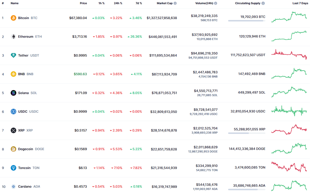 Alle anderen roten Münzen fielen ebenfalls um etwa 1 %, mit Ausnahme von Bitcoin (BTC). Er verlor 0,3 % und wechselte bei 69.590 $ den Besitzer.