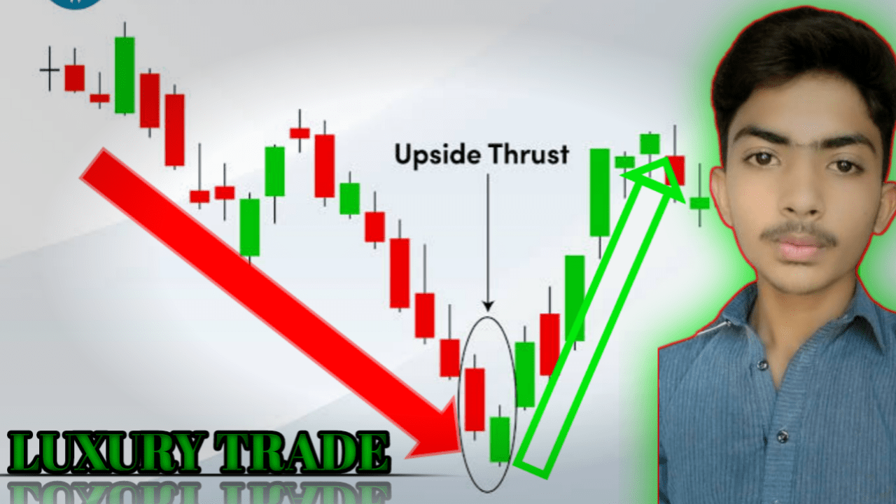 8. Thrust: Ein Thrust ist ein bullisches Muster, das entsteht, wenn eine grüne Kerze über dem Hoch der vorherigen roten Kerze schließt und damit eine starke Aufwärtsbewegung anzeigt.