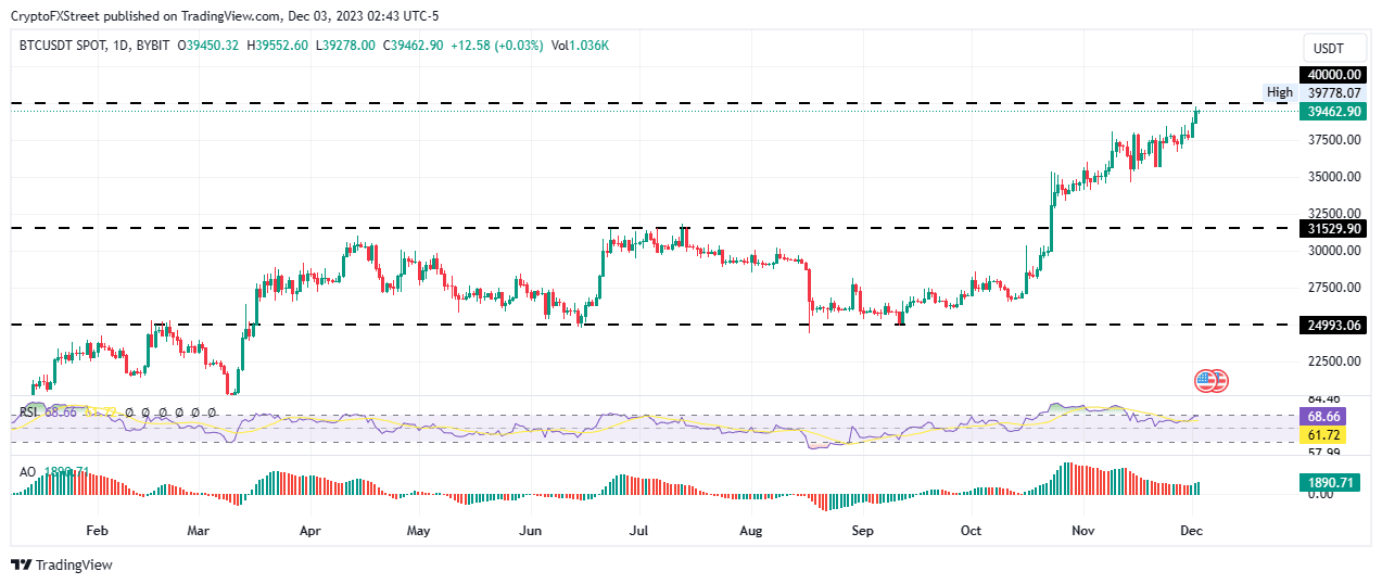 Darüber hinaus liegt der Awesome Oscillator (AO) im positiven Bereich, mit grünen Histogrammbalken, was darauf hindeutet, dass die Bullen den Markt anführen. Erhöhter Kaufdruck könnte daher dazu führen, dass der Bitcoin-Preis vom aktuellen Preis von 39.462 USD (Stand 8:00 Uhr GMT) aus ansteigt, den Bereich von 39.778 USD überschreitet und dann die psychologische Marke von 40.000 USD durchbricht.