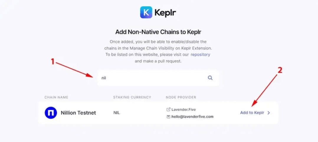 Öffnen Sie die Keplr Chains-Seite und suchen Sie nach „Nillion“. Klicken Sie auf „Zu Keplr hinzufügen“.