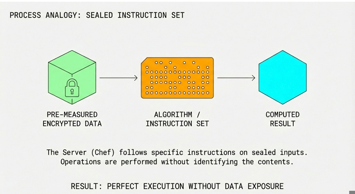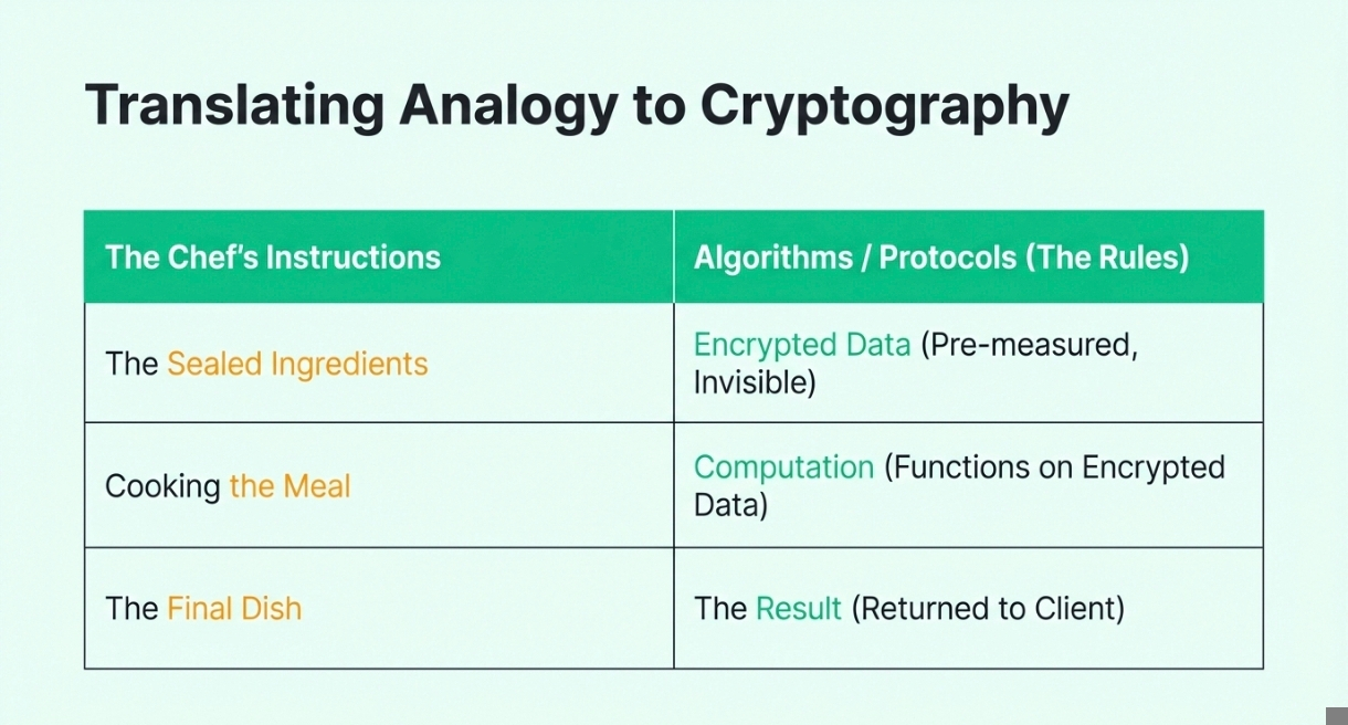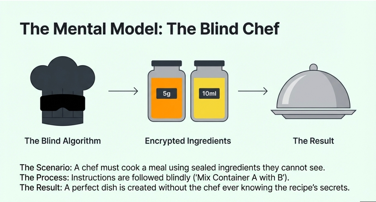 The steps are carried out without needing to decrypt the data. The final dish is the computed result. Just like you prepared the dish without knowing the ingredients, blind computation allows you to get results without knowing the input data. This method ensures privacy and security, as the data remains hidden (or "blind") during the computation process.