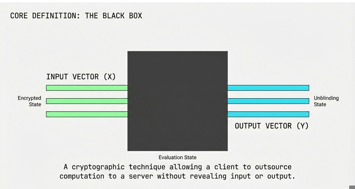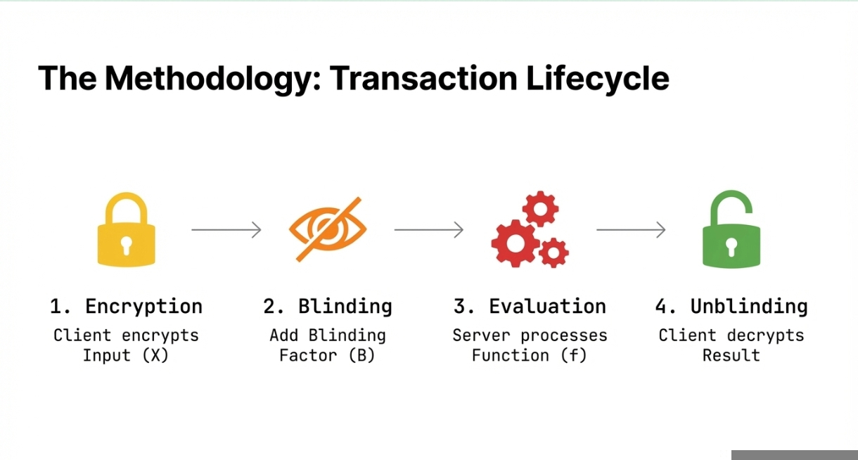 Evaluation: The server receives the blinded input and performs the computation on it according to the provided function (f). The server processes the data without knowing the actual input or the function being applied, ensuring the client's privacy.