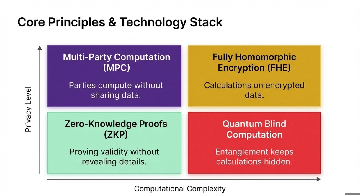 Quantum Blind Computation: Uses principles from quantum physics, like entanglement and superposition, to keep data and calculations hidden from the server doing the computation.