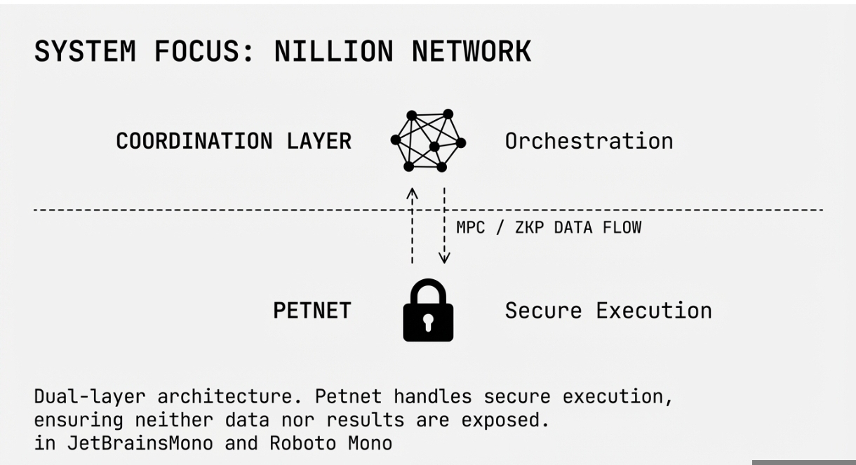 The network is structured with a dual-layer architecture: the Coordination Layer and Petnet. The Coordination Layer manages the orchestration of computations, while Petnet handles the secure and private execution of these computations. This combination allows Nillion to perform computations in a manner that protects sensitive data, ensuring that neither the data itself nor the results of the computation are exposed to unauthorized parties.