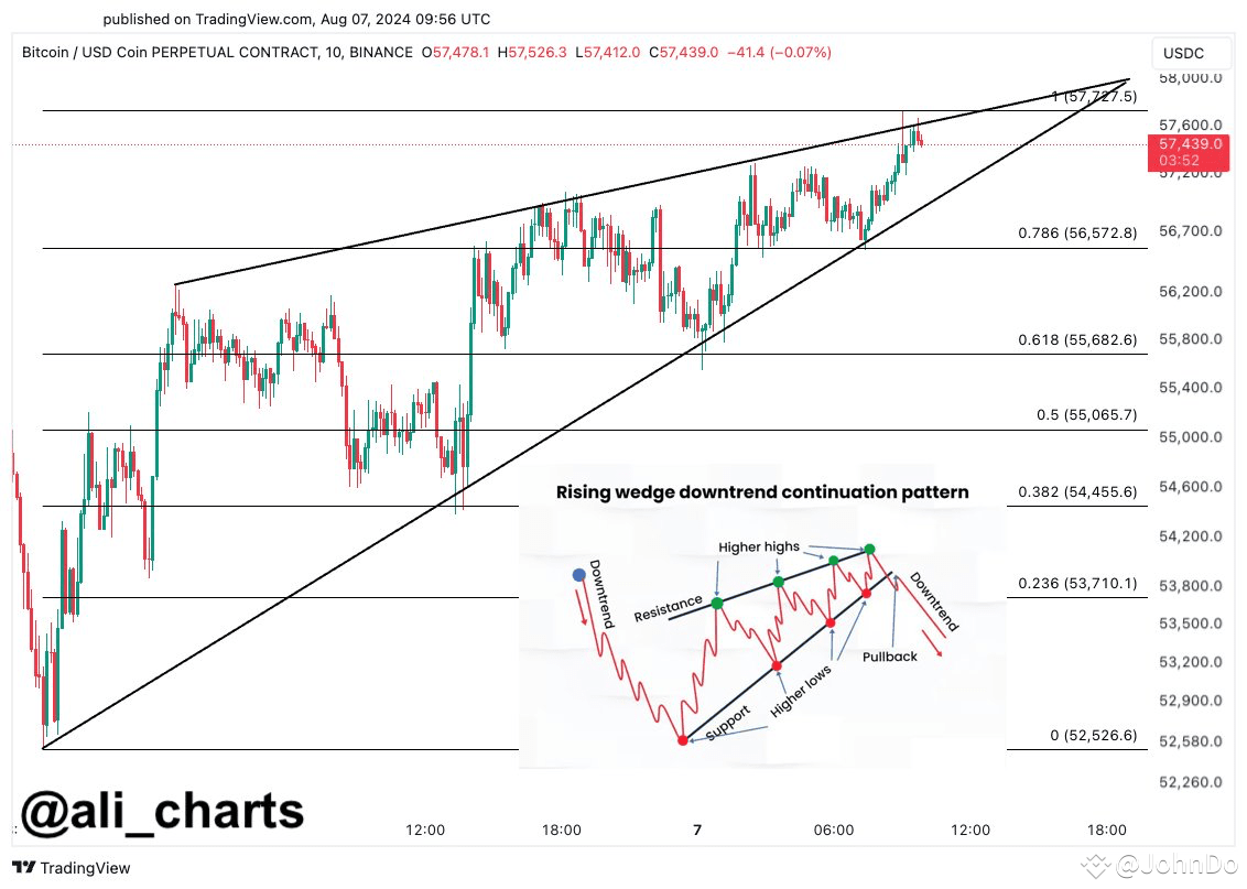 - Nhà phân tích tiền điện tử Ali cho biết Bitcoin đang hình thành mô hình "cái nêm tăng", thường liên quan đến xu hướng giảm, với dự đoán giá có thể lên 56.000 - 57.000 đô la nhưng cũng có thể giảm xuống 51.000 đô la.